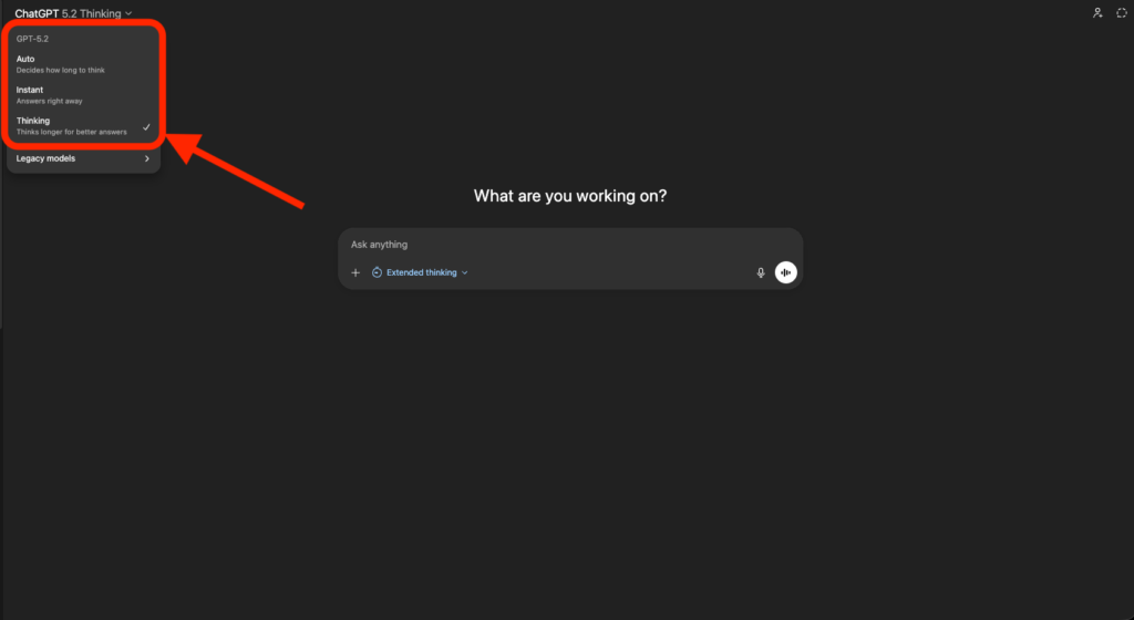 上記の画像のように、「GPT-5.2 Auto」(自動切替)、「GPT-5.2 Instant」、「GPT-5.2 Thinking」、「GPT-5.2 Pro」といった選択肢が表示されているはずです。