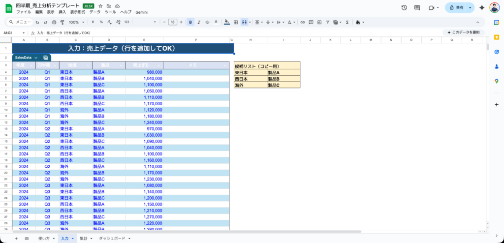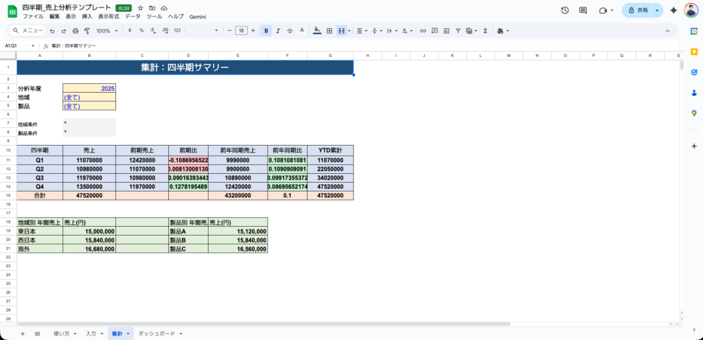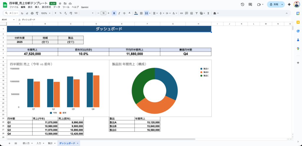四半期の売上分析スプレッドシートを作成して実行時間は13分ほど、実行結果は以下の通りでした。