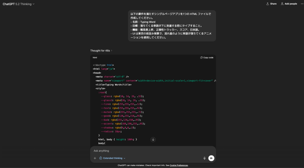 入力したあとに単語を撃破する要素が欲しいところですが、ワンショットでこのクオリティのゲームを生成してくれました。