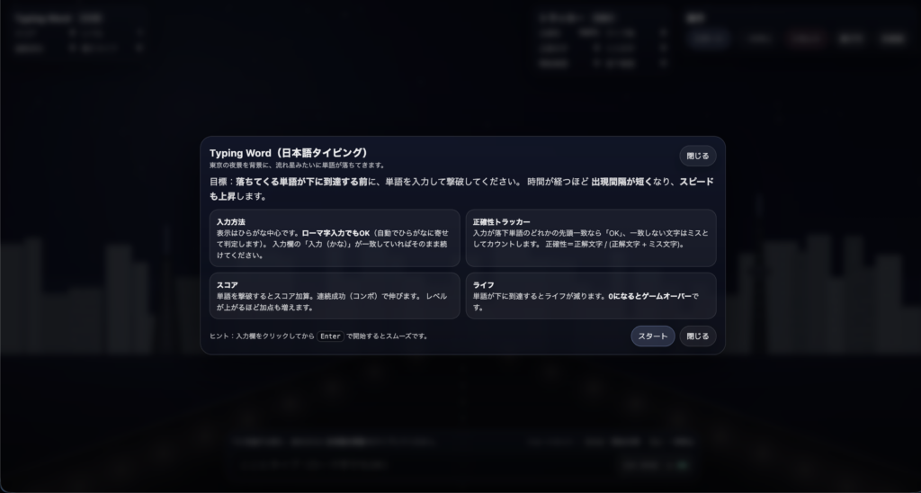 - UI は東京の街並み背景で、流れ星のように単語が落ちてくるアニメーションを使用してください。