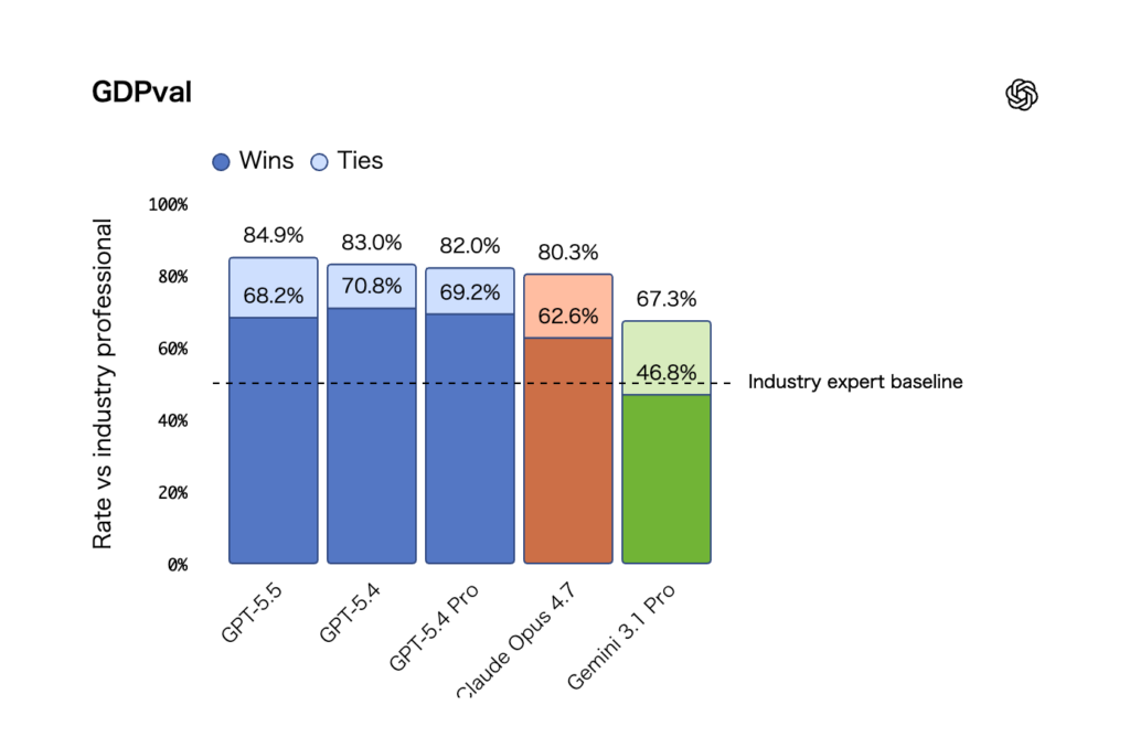 GPT-5.5は、情報収集・理解・ツール操作・アウトプット確認・成果物化という知識業務をより自然な形でこなせます。44種類の職業にわたる知識業務能力を測るGDPValでは84.9%を記録し、Claude Opus 4.7(80.3%)やGemini 3.1 Pro(67.3%)を上回っています。