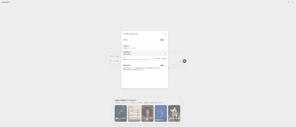 チャット画面でThinkingを選択します。モデル名選択では具体的なモデル名が表示されないので、「設定する」でモデル名を確認することが可能です。