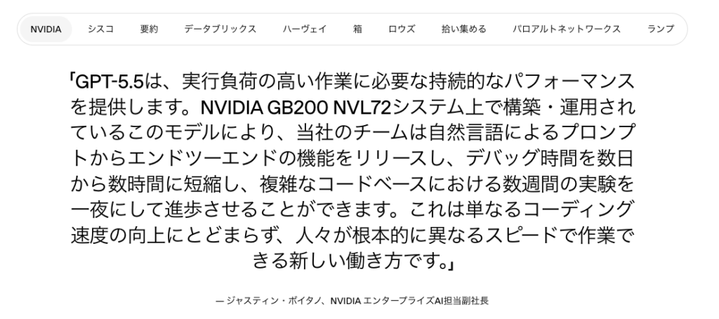 単なる性能向上にとどまらず、GPT-5.5は「AIに作業を補助させる」段階から「AIと協働して業務を進める」段階へと進化させるモデルといえるでしょう。複雑なタスクをまとめて任せられる設計により、業務プロセス全体の効率化や高度化が期待できます。
