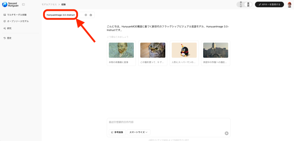 それでは実際に、HunyuanImage 3.0-Instructを公式Webチャットページで試していきます。