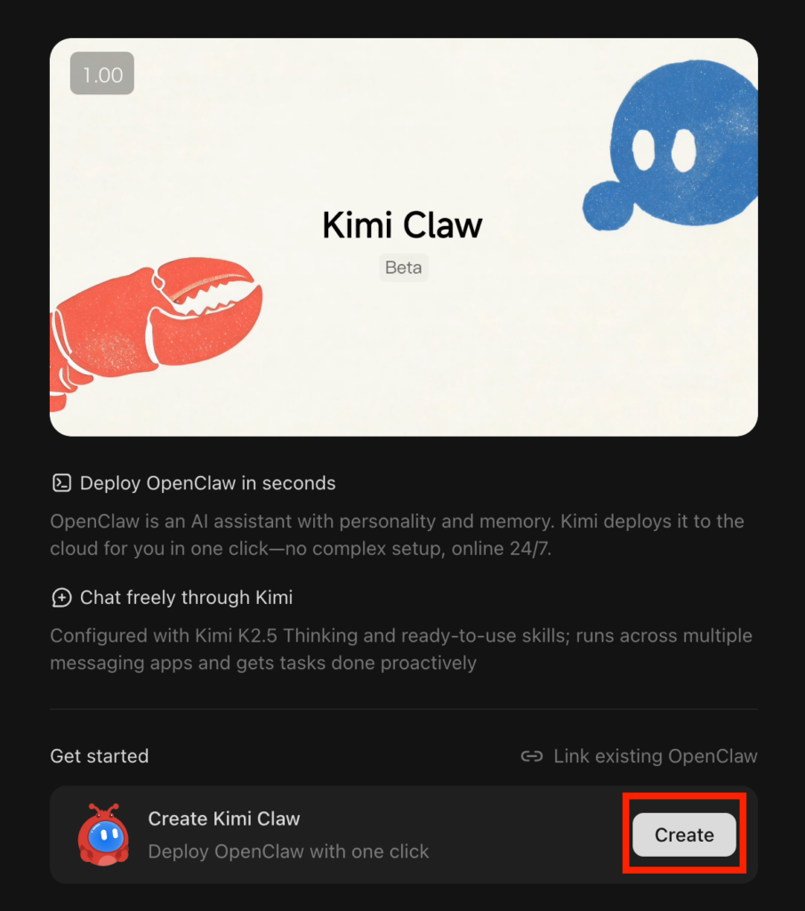 Kimi Clawは、OpenClawをベースにした24時間稼働型のAIエージェントをクラウド上で提供するサービス。ローカルで常時起動するPCや自前サーバーなしに、ブラウザからワンクリックで利用できます。