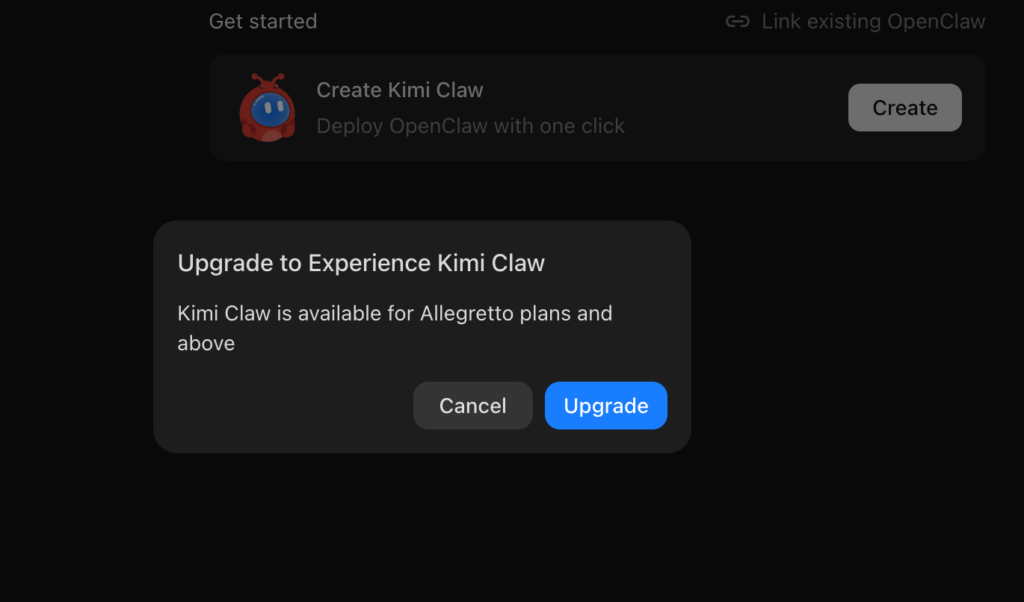 Kimi Clawはベータ版として提供されており、利用するにはAllegretto以上のプランに課金する必要があります。