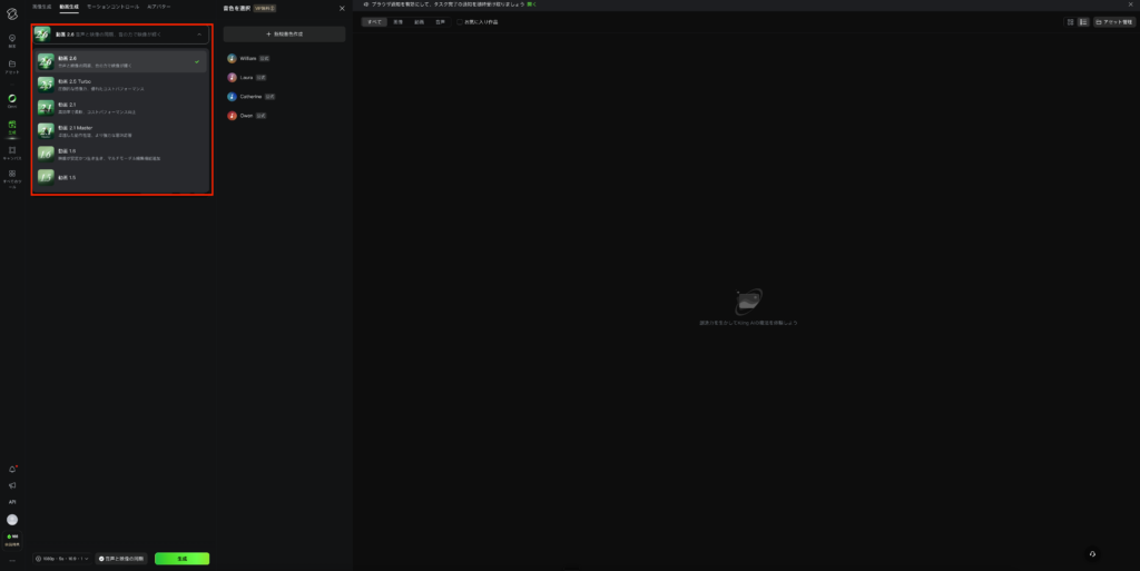 Kling AI 3.0を使用するには、Kling AIにアクセスし、生成を行う際にモデルを選択すればOKです。