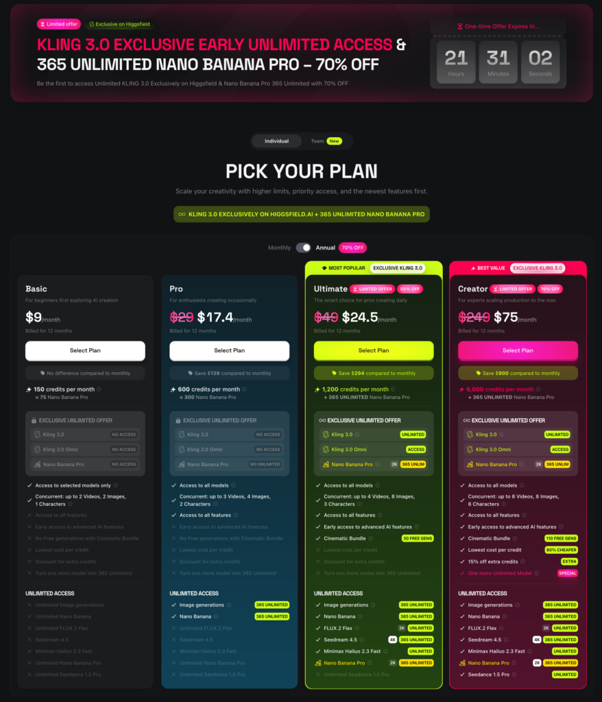 また、Higgsfield AIがDay 0でKling AI 3.0を使えるようになっており、かつサブスク料金が70%オフになっているのでサブスク利用するのであればHiggsfield AIが良いかもしれません。