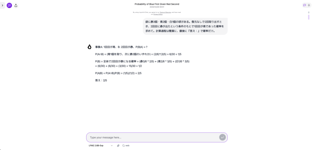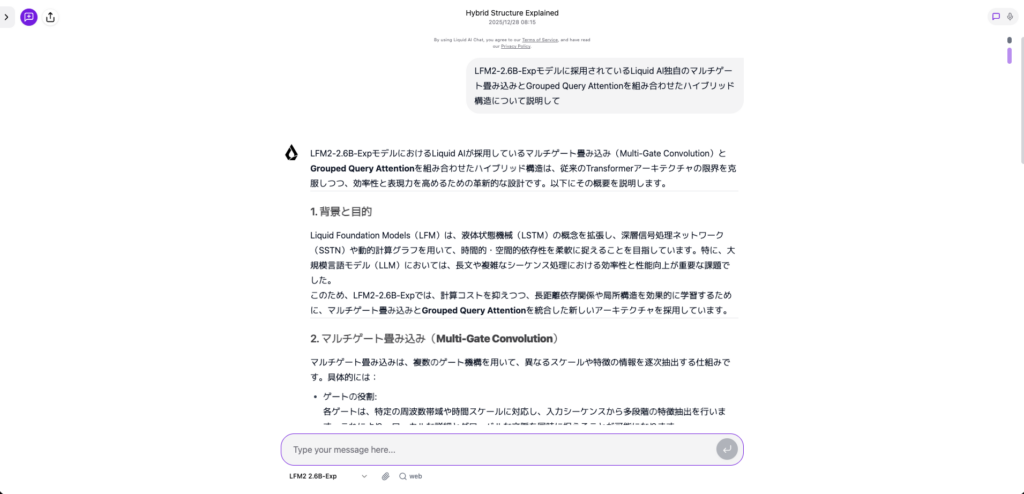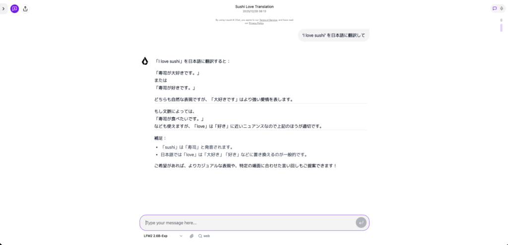 それでは実際に、LFM2-2.6B-ExpをLiquid Playgroundで試してみます。