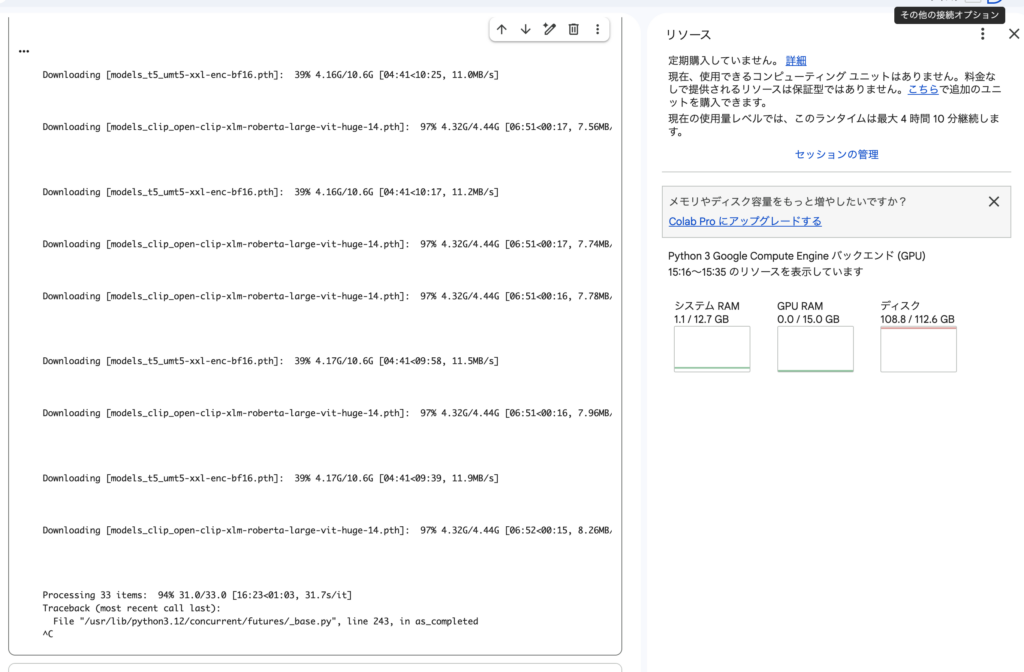 上記はモデルダウンロード途中のディスク使用量です。約10GBのファイルを10個くらいダウンロードする必要があり、さらにはHugging Faceからローカルにダウンロードしたウェイトをアップロードする必要があります。
