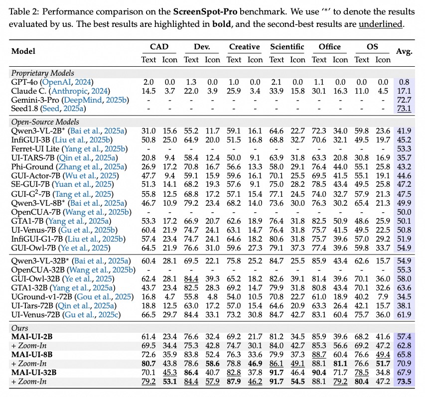その結果、ScreenSpot-ProやMMBench GUIといった評価環境で高いスコアを達成。静的なUI理解にとどまらず、画面遷移を伴うタスクに強い点がポイントです。