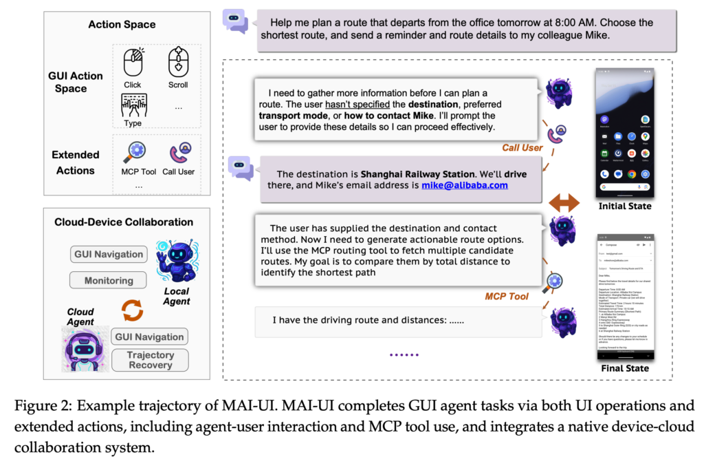 MAI-UIはこれらに対して、ユーザーへの確認(ask_user)とMCPツール呼び出し(mcp_call)を含む拡張アクション、タスク状態とデータ感度に応じて端末/クラウド実行を切り替えるdevice-cloud協調、動的環境でのonline RLなどを組み合わせる方針を採用。