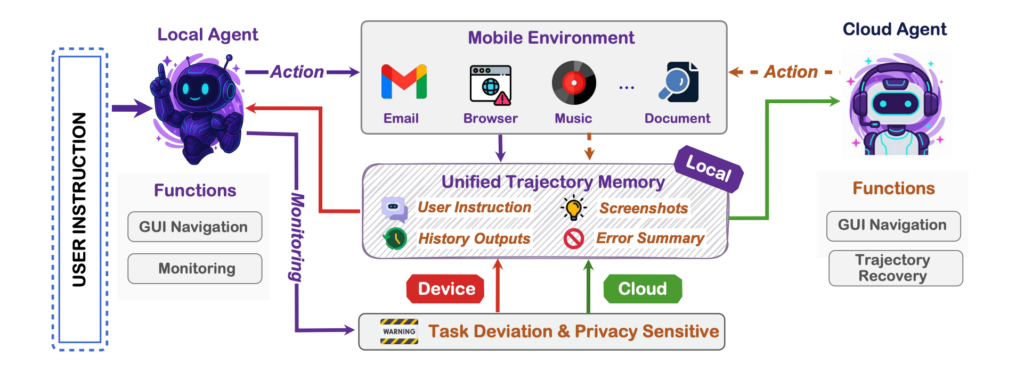 まず安全性について、MAI-UIは端末とクラウドを役割分担させる設計方針を採っています。個人情報や即時性が求められる処理は端末側で行い、計算負荷の高い推論や学習関連はクラウド側で担う構成です。