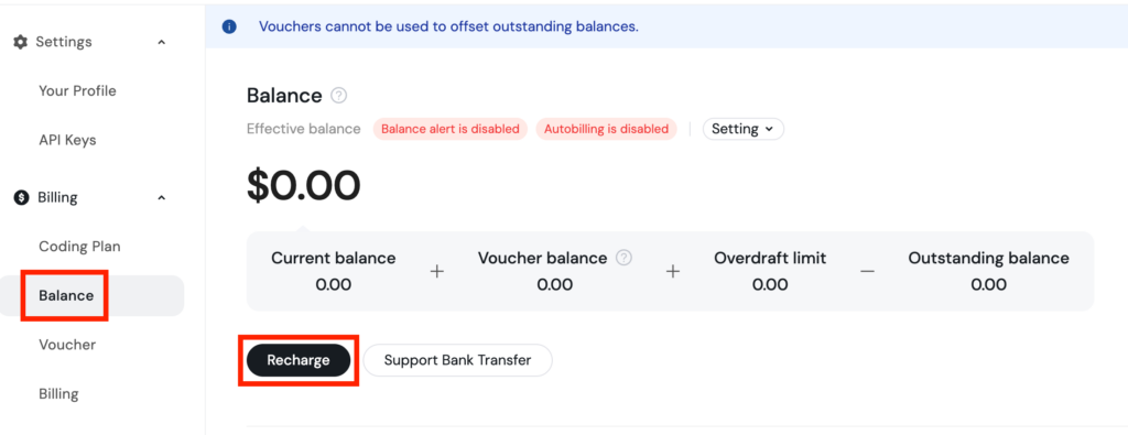 また事前に支払いをする必要があるので、「Balance」→「Recharge」で課金をしておきます。