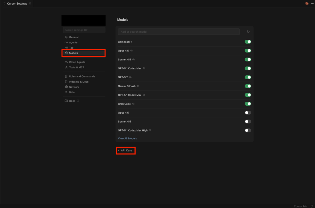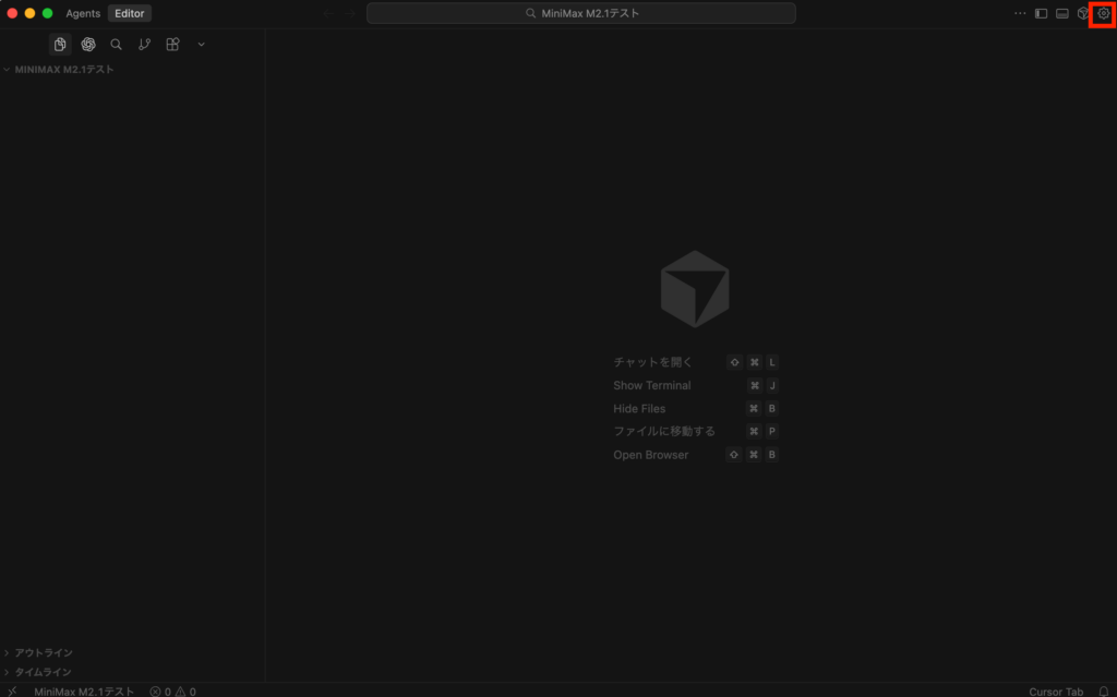 まずはCursorにAPIキーを登録します。Cursorの右上歯車マークから設定画面を呼び出します。