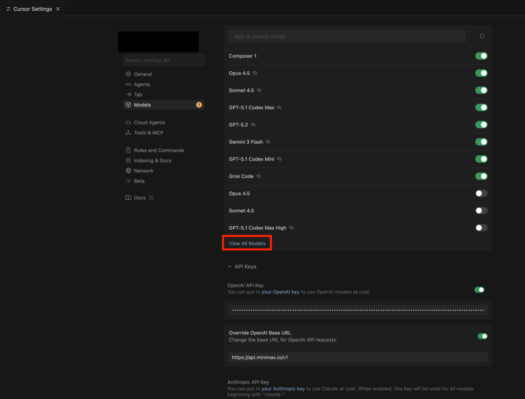 OpenAI API KeyにMiniMax-M2.1のAPIキーを入力し、Base URLを下記に設定。