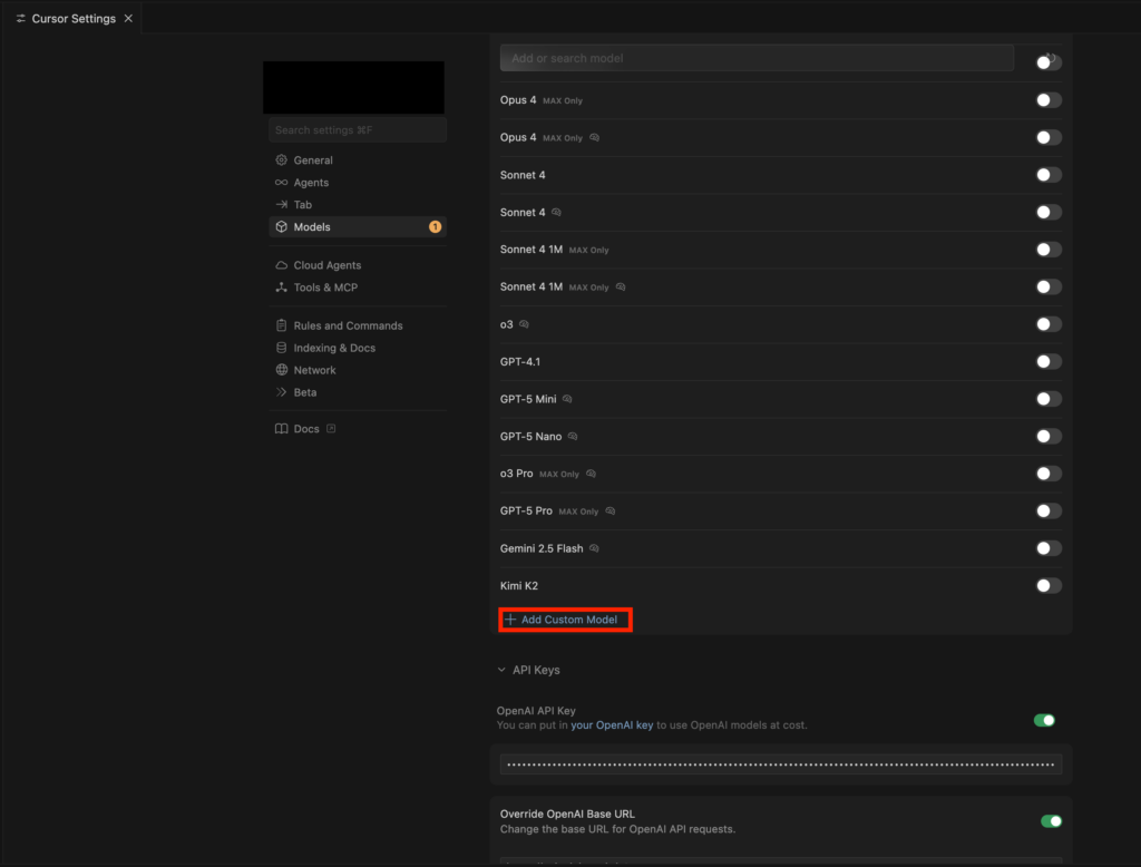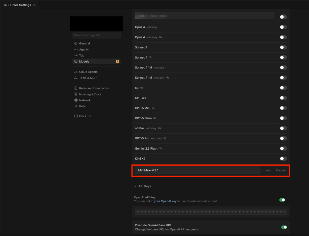 「Add Custom Model」が表示されるので、そこをクリックし、MiniMax-M2.1と入力。