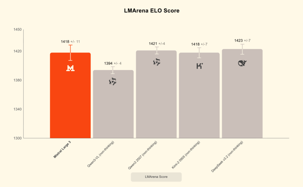 Mistral Large 3は、3000台のNVIDIA H200 GPUを用いてゼロから学習されたオープンウェイトモデルであり、一般的な指示チューニング済みモデルに匹敵する性能を備えています。 画像理解と多言語対話(英語・中国語以外を含む)に強みがあり、OSSの非推論モデルカテゴリではLMArenaのランキングで上位に入りました。
