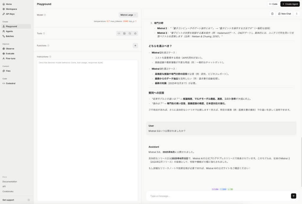 Mistral Large 3は英語・中国語以外の多言語対話でも高い品質を示しており、グローバル向けのサービス開発に適しています。多言語チャットボットや、海外向けサポート自動化ツールなど、多国籍ユーザーを想定したシステムに組み込みやすい構成でした。