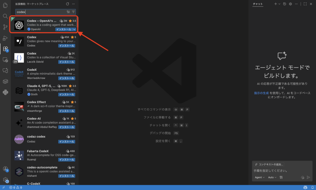 今回はVS Codeを例に確認してみましょう。拡張機能でCodexを検索し、インストールします。