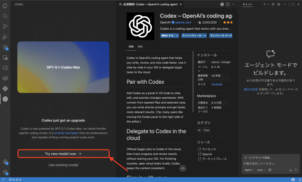 インストールしてCodex IDE拡張を開くと、以下の画像のような表示が出るので、「Try new model now」をクリックします。