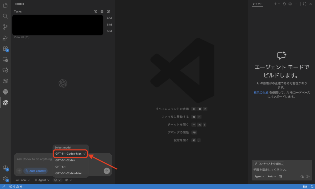 するとチャット画面が表示され、GPT-5.1-Codex-Maxモデル選択ができていることが確認できます。