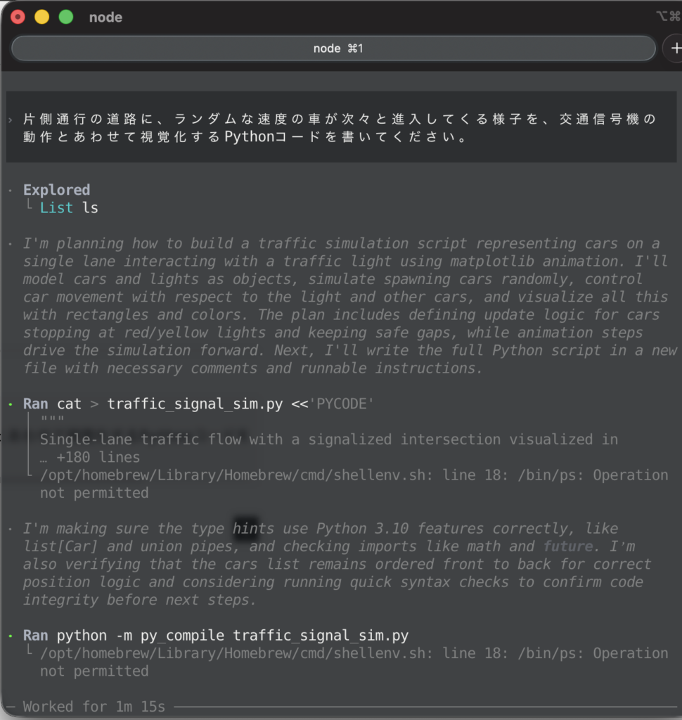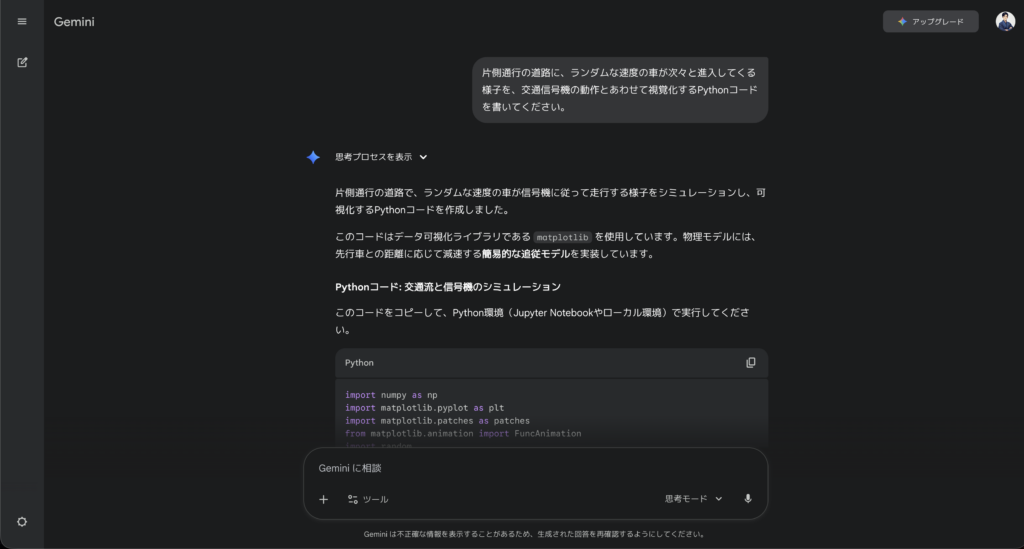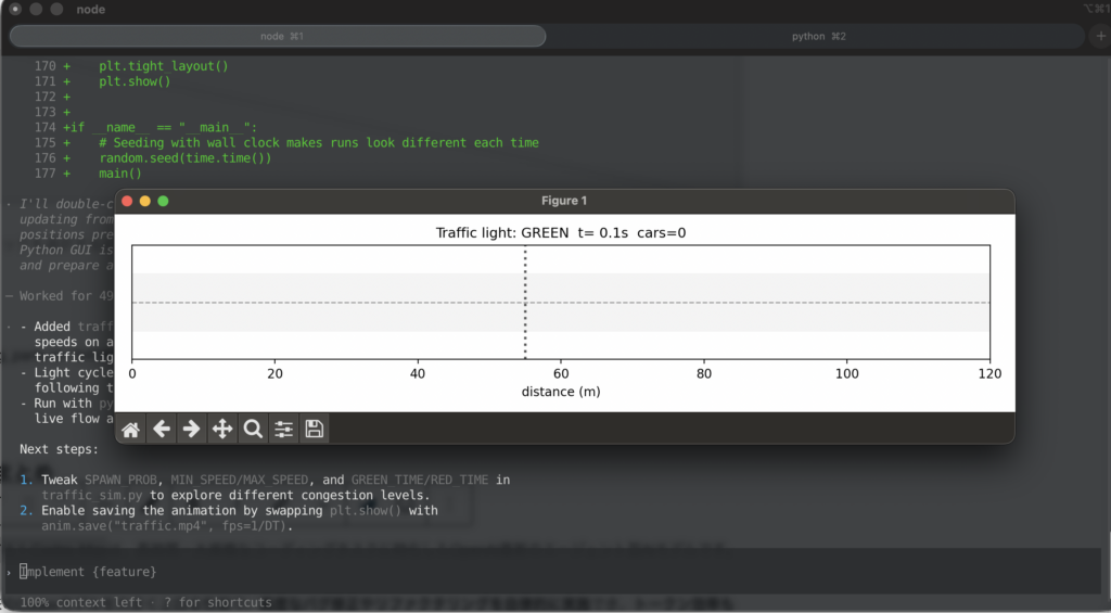 良い感じです!修正依頼をかければ、こちらの意図通りに、ランダムな速度の車が次々と進入してくる様子を、交通信号機の動作とあわせて視覚化してくれています。