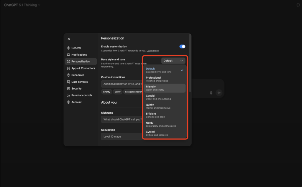 さらにGPT-5.1では、ChatGPT全体のパーソナライズ(個性設定)機能が強化された点も見逃せません。