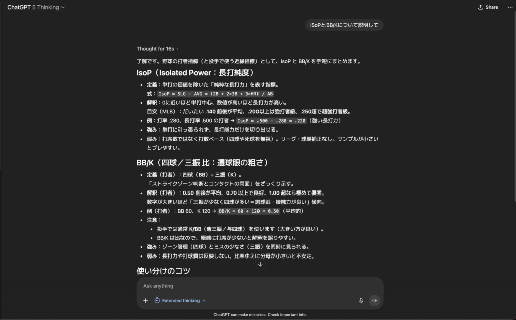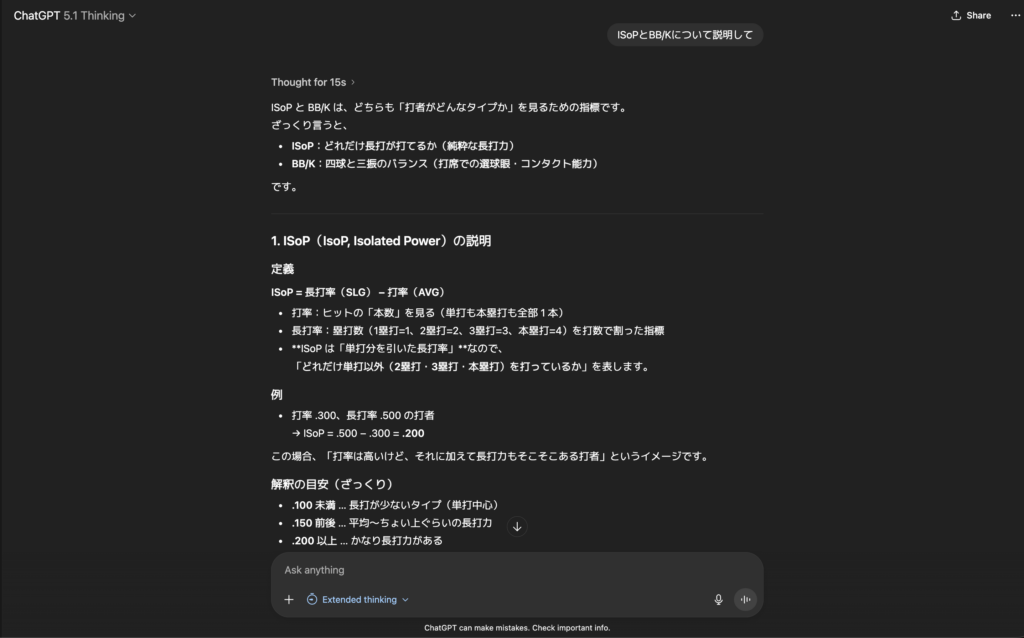 例えば、技術的な質問でも、GPT-5.1 Thinkingならできるだけ平易な言葉で噛み砕いて説明してくれるのです。これによって、「賢いけれど難解」というAI特有のもどかしさが和らぎ、専門的な内容でも対話相手として親切な印象を受けることができると思います。