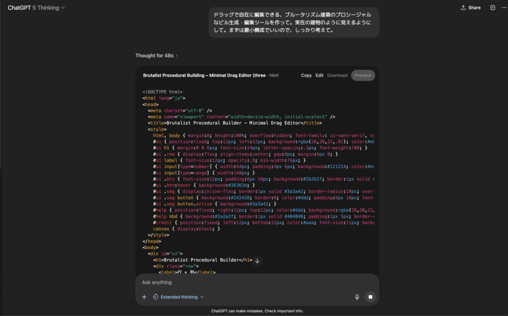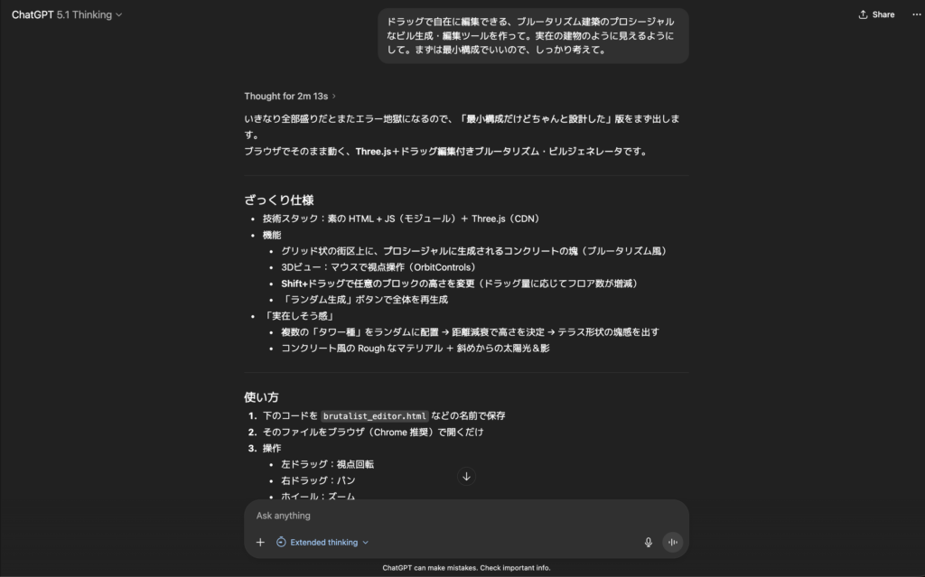 それぞれのモデルの性能差はあまり無い印象でしたが、GPT-5.1 Thinkingのほうが、若干クオリティの高い描写を再現してくれたのと、コーディングに入る前に要件を整理してくれたのが良いポイントだと感じました。