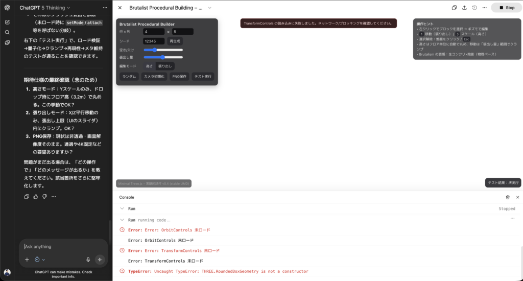 GPT-5.1 Thinkingはエラー発生懸念も考慮して、仕様確認などの前提条件を整理したのちにコーディングを進めてくれました。