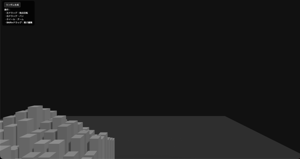HTML実行してみると、以下のような3Dアプリが確認できました。GPT-5 Thinkingと比べてビル群の描写が細かく再現されている気がしますが、最小構成ということで操作機能(ドラッグやズーム)までは反映されていませんでした。