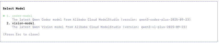 Qwen Codeで使われているモデルについての言及を見つけられませんでしたが、Qwen Codeを起動してモデルを確認してみると下記のモデルでした。