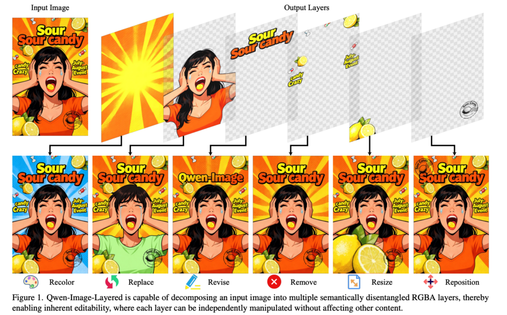 Qwen-Image-Layeredの最大の特徴は、画像を意味的に独立したRGBAレイヤーとして扱える点。