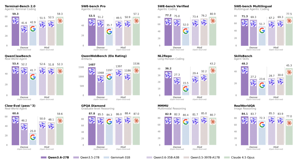 - Qwen3.6-27Bは27B Dense構成で前世代MoEを上回るコーディング性能