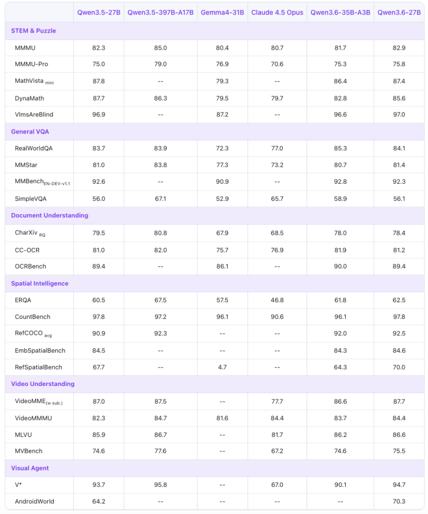 Qwen3.6-27Bはテキスト・画像・動画を1つのモデルで統合的に処理できるマルチモーダルモデルです。MMMUでは82.9を記録し、Claude 4.5 Opus(80.7)を上回ります。