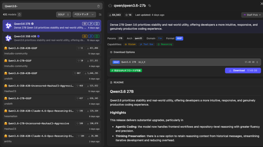 モデルをダウンロードして、Qwen3.6-35B-A3Bと比較してみます。