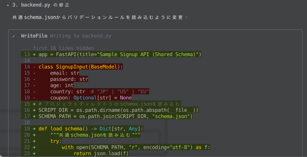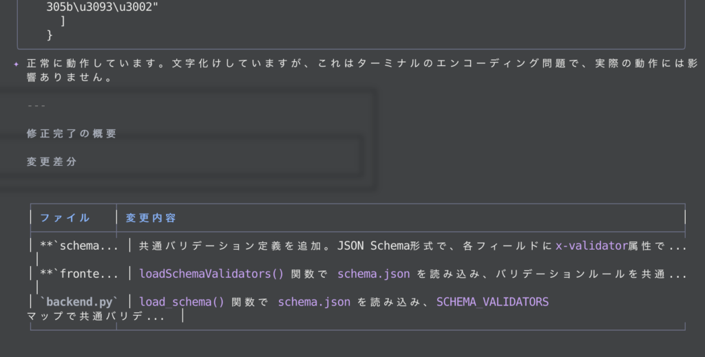 続いて、共通スキーマを新規作成しながら、既存ファイルの改修をしてくれました。