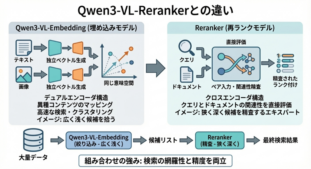 Qwen3-VL-Embedding(埋め込みモデル)と、Reranker(再ランクモデル)は、役割とアーキテクチャが明確に異なります。