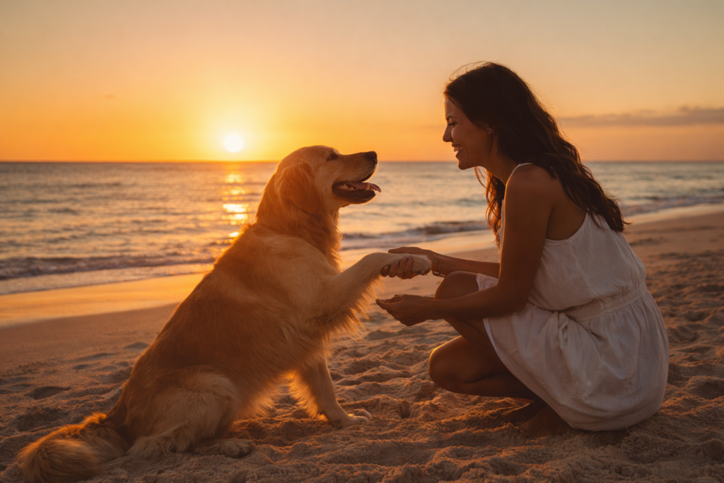 {"text": "夕日の海辺で、女性がゴールデンレトリバーと握手している写真"}
