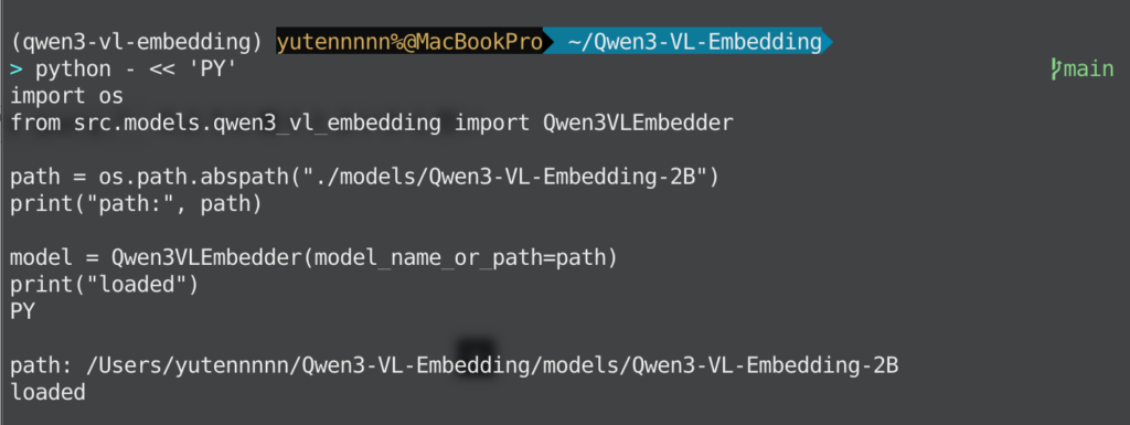 model = Qwen3VLEmbedder(model_name_or_path="Qwen/Qwen3-VL-Embedding-2B")上記のようにmodel_name_or_pathにHugging Face上のモデル名を渡すと、自動的にモデルをダウンロード&ロードしてくれます。GitHubからファイルをダウンロード済みの場合は、そのパスを指定することも可能です。