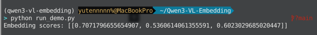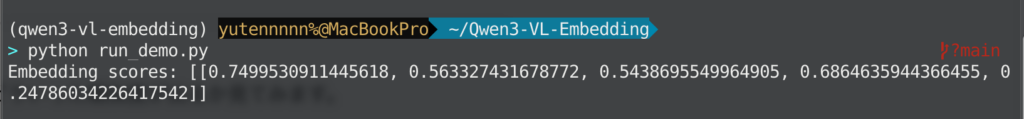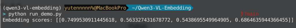 Qwen3VLEmbedderにはmodel.process()というメソッドが用意されていて、これに入力リストを渡すだけで対応するベクトルが返ってきます。今回の例ではqueries + documentsを一つのリストに結合し、それをprocess()に渡すと計4件分のベクトルが得られるイメージです。