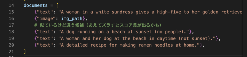 ]上記ではクエリは日本語テキスト、ドキュメント候補には英語テキスト説明や画像を入れています。実際には、さらに複数のクエリや多数の候補をまとめて処理できますが、まずはシンプルに考えておきましょう。