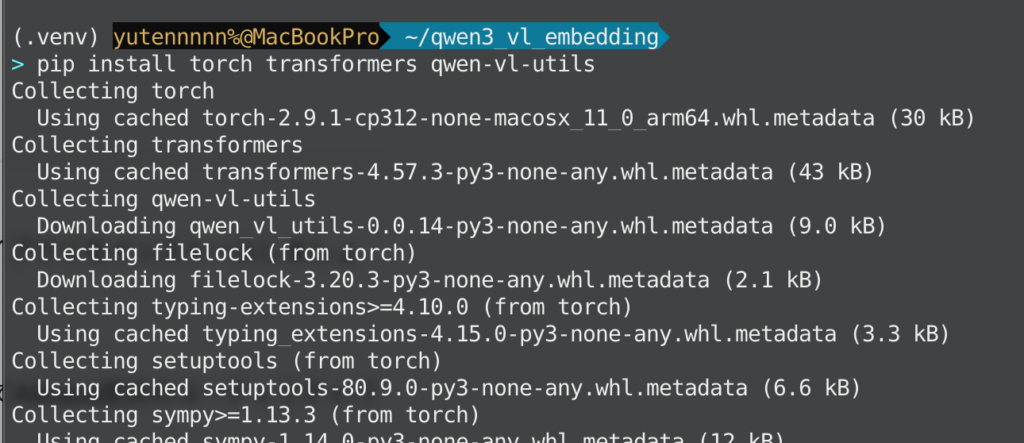 Qwen3-VL-Embeddingを扱うには、PyTorchとHugging Face Transformers、そしてAlibaba提供のユーティリティパッケージqwen-vl-utilsが必要です。以下のコマンドでインストールできます。