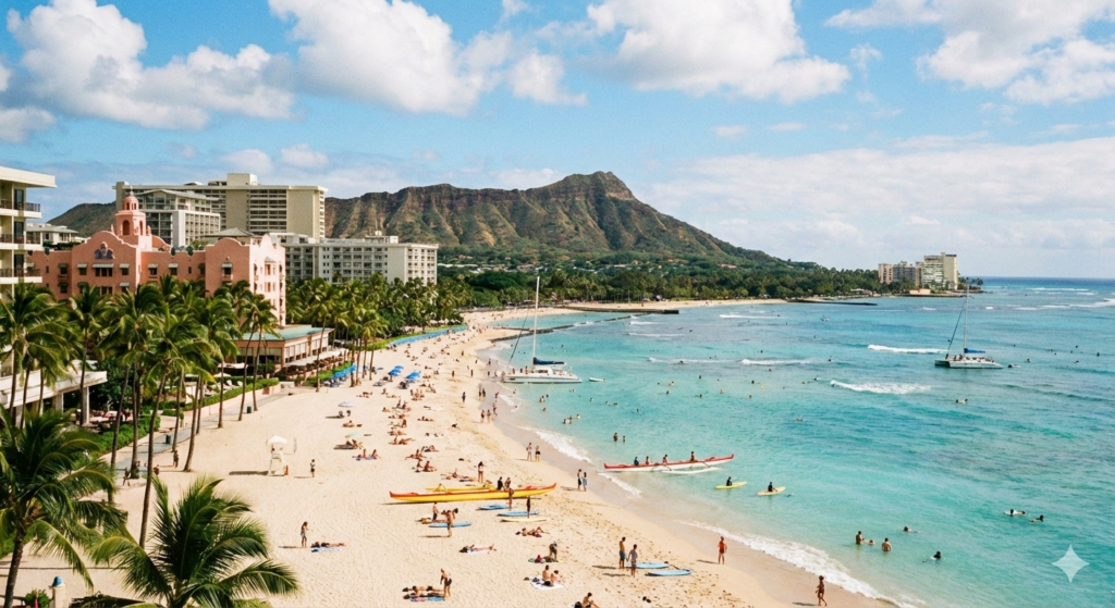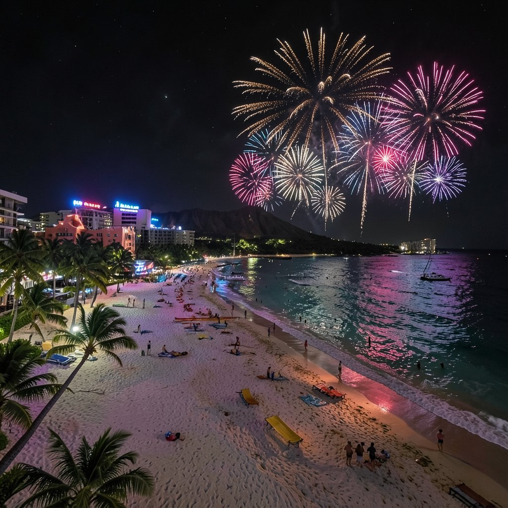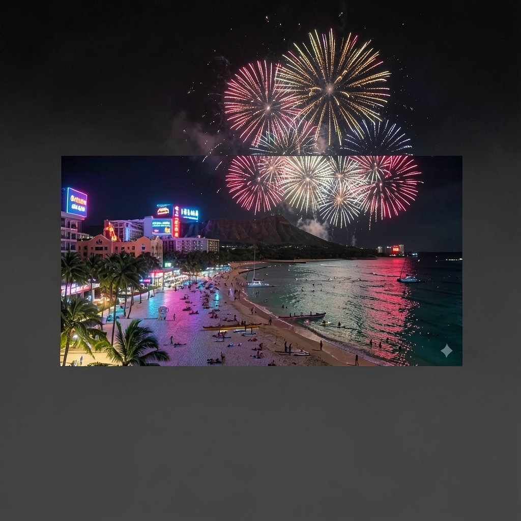 ネオン街感をなくして夜のワイキキビーチを再現して。花火も画像フレームから飛び出さないように調整して。