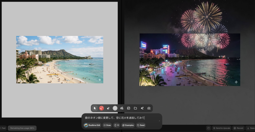 Realtime Editは、従来の画像編集や生成AIとは一線を画す画期的なツールです。Photoshopのように、手動で細かな調整を重ねたり、テキスト生成AIでプロンプトを送信して結果を待ったりする必要はもうありません。