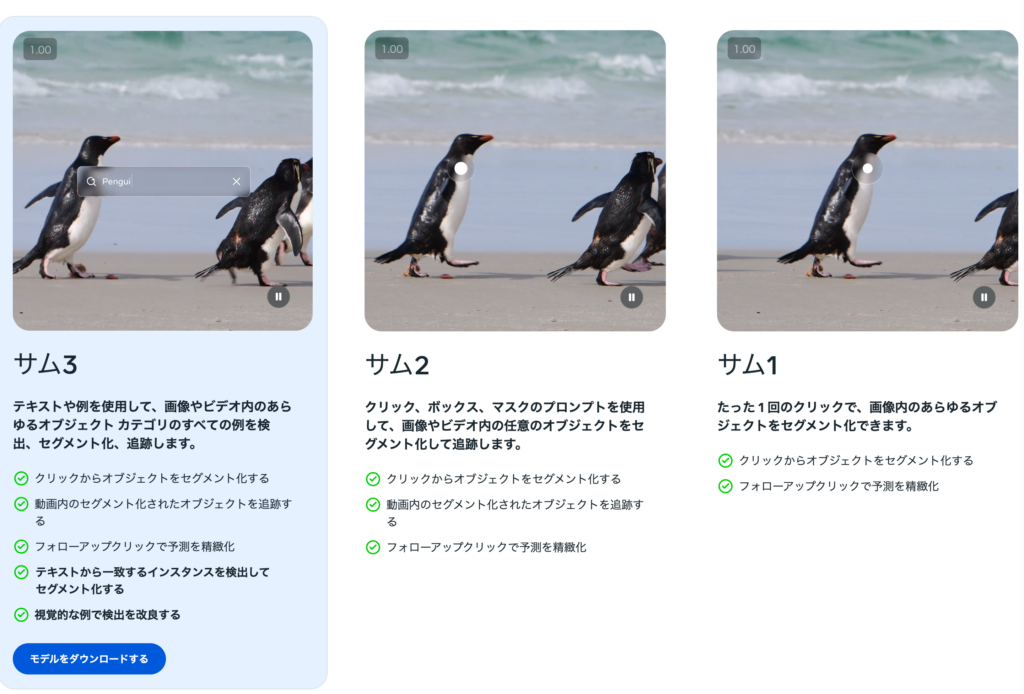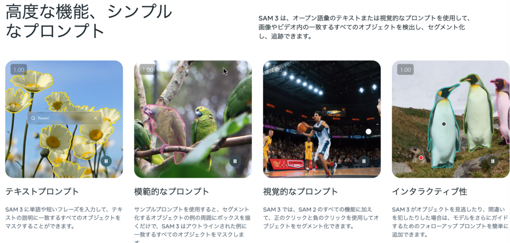 SAM3は、画像や動画に写る対象を切り出したり追跡したりするための処理を幅広く扱えるモデルとして設計されており、従来のシリーズと比べても操作のしやすさや応用範囲が大きく広がっています。