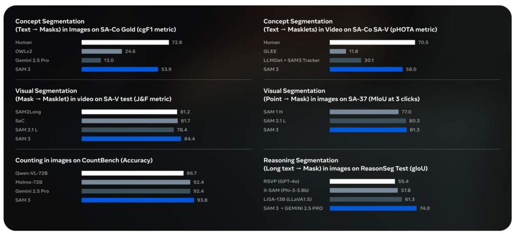 各種の評価指標では、テキストを使った指示でも視覚的な指示でも高い性能が示されており、静止画だけでなく動画に対するマスク生成や追跡でも安定した精度を発揮。こうした特徴は、実務の場で必要となる処理の再現性を高めるうえで重要なポイントといえます。※2