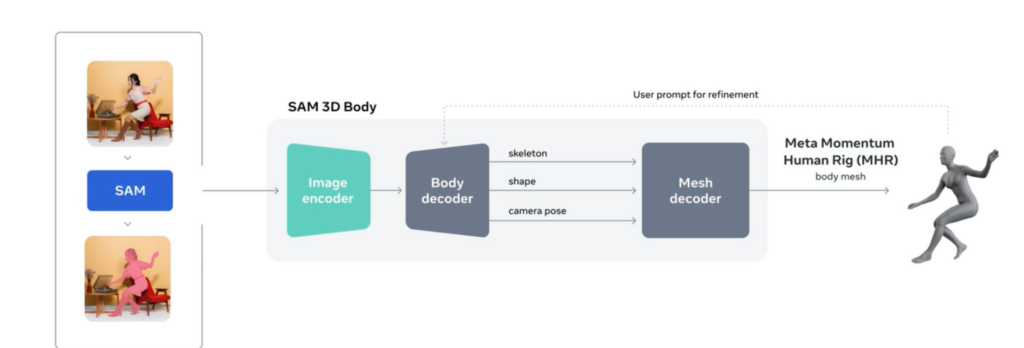 モデルには、骨格と体の形状を分離して扱えるMeta Momentum Human Rig(MHR)が使用されており、人の体を理解するために機能しています。