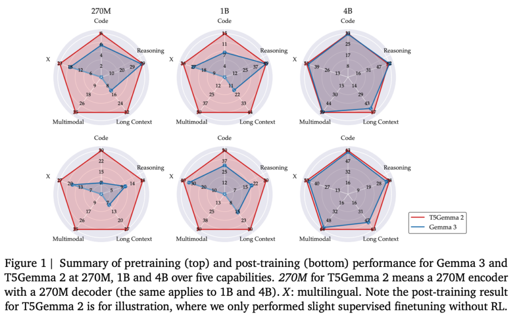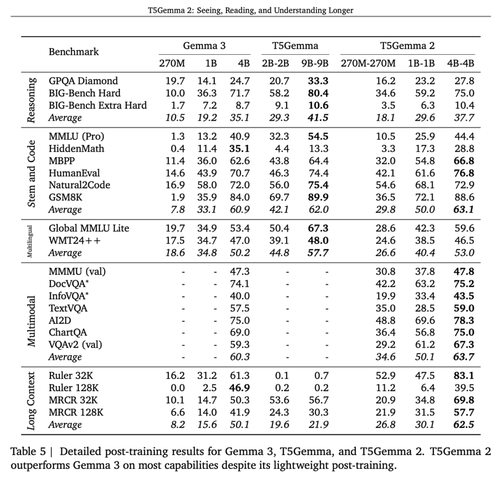 下記の図はT5Gemma 2に軽量なpost-trainingのみを施した後の性能です。